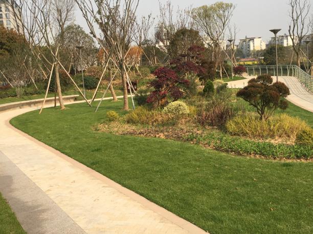 綠化則堆土成坡,緩急錯(cuò)落,成片成林種植開(kāi)花或觀葉植物。冬可賞紅梅朵朵暗香輕襲,春有櫻花林落英繽紛如沐花雨,夏可至荷風(fēng)四面觀芙蓉出水妖妖灼灼,秋則可賞丹桂若云楓紅似火。背景林以中尺度常規(guī)常綠喬木形成屏障,大尺度和中尺度落葉喬木片植或點(diǎn)植,滿(mǎn)足秋冬兩季的觀賞需求。活動(dòng)空間沿路片植或點(diǎn)植開(kāi)花類(lèi)喬木,提高整個(gè)空間的色彩視覺(jué)效果,增加植栽綠化對(duì)人群的趣味性。球類(lèi)灌木以無(wú)刺、耐修剪品種為主,種植于園路路口、沿路落葉喬木下,增加整個(gè)綠化空間的近距離觀感。